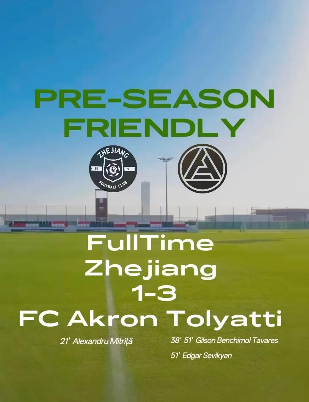 北京时间2月5日,浙江队与俄超球队陶里亚蒂阿克隆进行了一场友谊赛,最终浙江队1-3输给了陶里亚蒂阿克隆,米特里策在比赛的第21分钟破门。