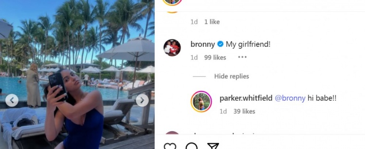 7月8日讯 湖人球星詹姆斯的儿子布朗尼近日和女友在社媒上秀起恩爱。在女友帕克-惠特菲尔德最新的发布的度假动态上布朗尼评论写道:“这是我的女朋友!”惠特菲尔德则回复:“嗨我的小宝贝”。